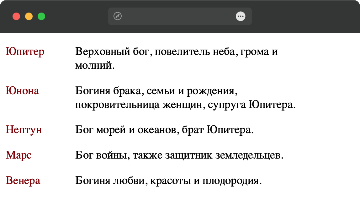<!DOCTYPE html> <html lang="ru"> <head> <meta charset="utf-8"> <title>Список</title> <style> .rome { display: flex; flex-wrap: wrap; & > dt { color: maroon; flex-basis: 20%; } & > dd { flex-basis: 70%; margin-left: 0; margin-bottom: 1em; } } </style> </head> <body> <dl class="rome"> <dt>Юпитер</dt> <dd>Верховный бог, повелитель неба, грома и молний.</dd> <dt>Юнона</dt> <dd>Богиня брака, семьи и рождения, покровительница женщин, супруга Юпитера.</dd> <dt>Нептун</dt> <dd>Бог морей и океанов, брат Юпитера.</dd> <dt>Марс</dt> <dd>Бог войны, также защитник земледельцев.</dd> <dt>Венера</dt> <dd>Богиня любви, красоты и плодородия.</dd> </dl> </body> </html>